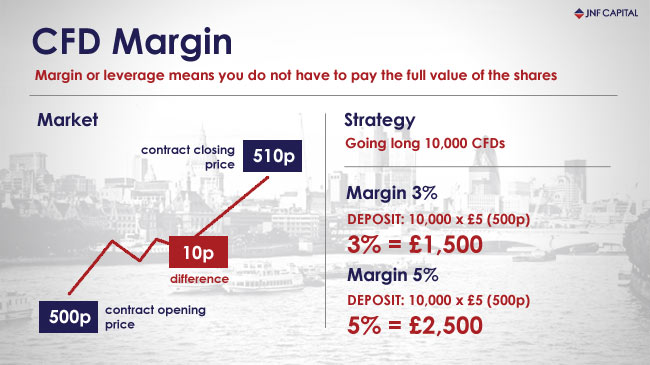 "Margin" is one of the most important aspects of CFD trading. Margin or leverage means you do not have to pay the full value of the shares. Instead, you put down a deposit. For example, the 'initial margin' for a share would usually be 3% or above (Margins are subject to change).