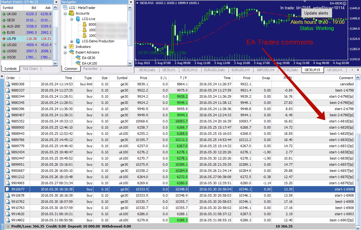 Last trading history on DAX30 and FTSE100 indicies. In order comment you can see that EA trades alerts from site and using both entry points Start price in confirmed alert and Best Price. Profit +200 pips per week on DAX30 and FTSE100 indicies.
