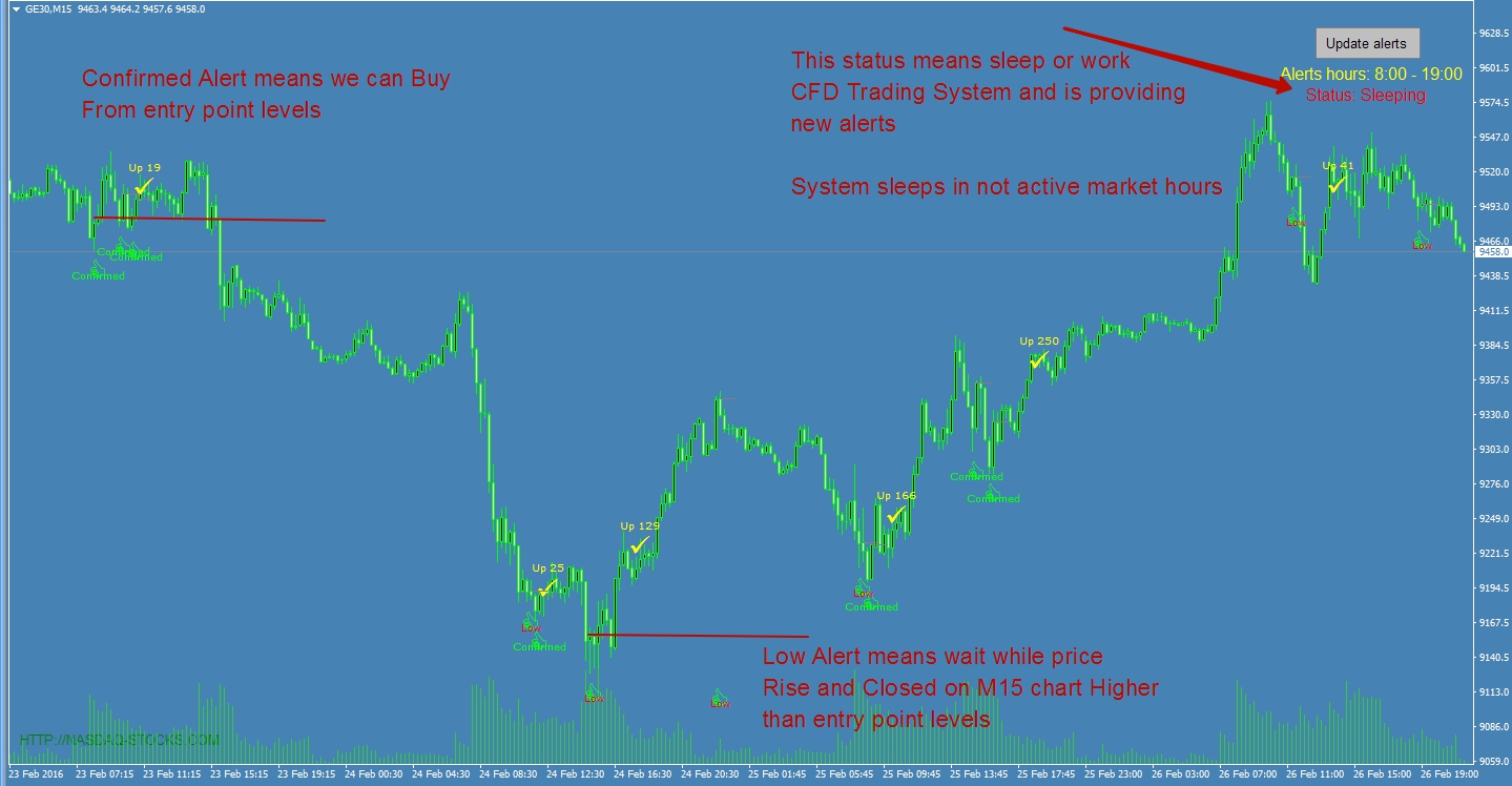 Mt4 indicators downloads alert data from server and paints it on chart. Please attach each indicator on same market (DAX30, FTSE100, S&P500, Dow Jones, NASDAQ100) in your terminal on period M15.